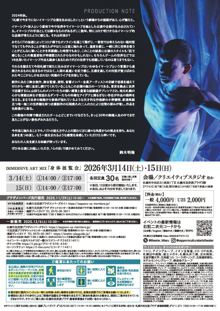 世界的にご活躍されている鈴木明倫さんが中心となりアイディアをまとめ、素晴らしいダンサー、アーティストの皆さまと作るイマーシブという新感覚の体験型ダンス公演という内容でして、